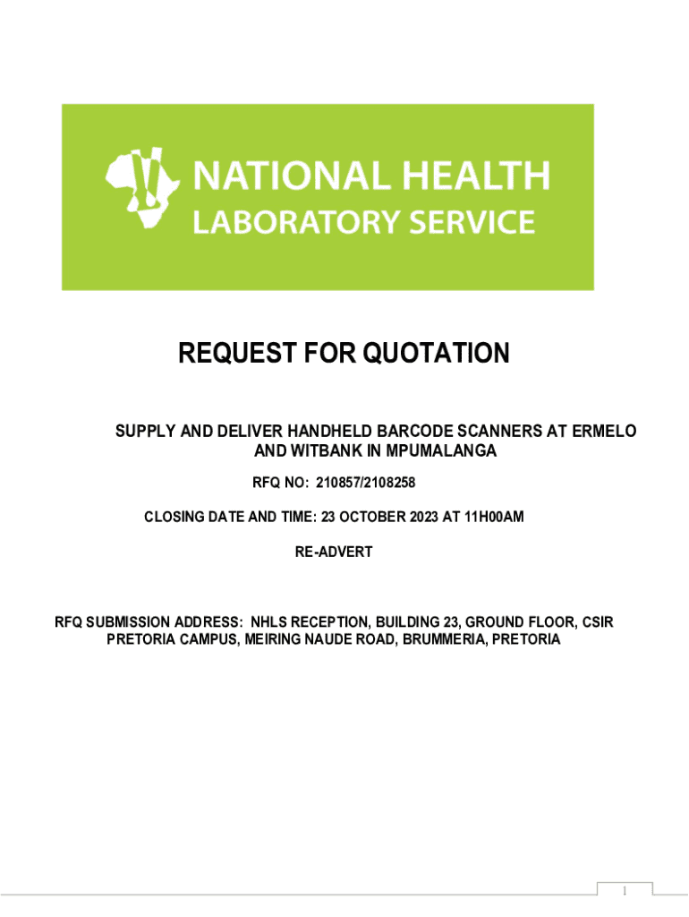REQUEST FOR QUOTATION SUPPLY AND DELIVER HANDHELD BARCODE SCANNERS AT ERMELO AND WITBANK IN MPUMALANGA RFQ NO: 210857/2108258 CLOSING DATE AND TIME: 23 OCTOBER 2023 AT 11H00AM READVERTRFQ SUBMISSION