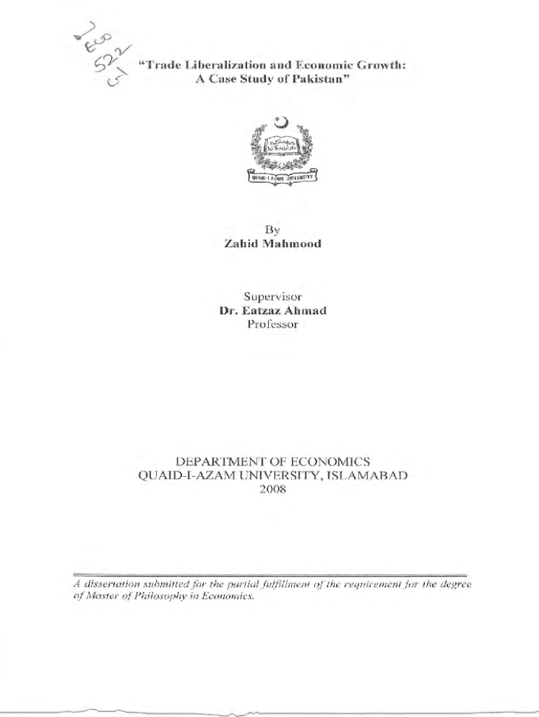 \"Trade Liberalization and Economic Growth: A Case Study of Pakistan\"By Zahid MahmoodSupervisor Dr. Eatzaz Ahmad ProfessorDEPARTMENT OF ECONOMICS QUAIDIAZAM UNIVERSITY, ISLAMABAD 2008A dissertation