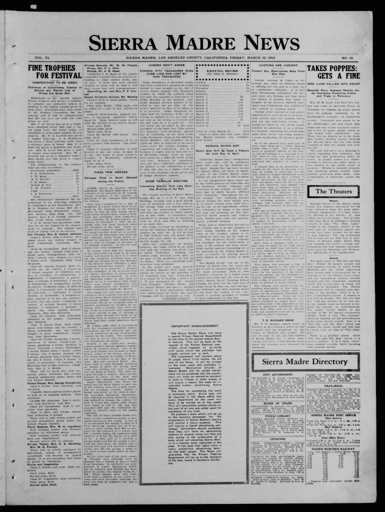 Sierra Madre News refers to local news and updates pertaining to the city of Sierra Madre, California, covering events, city council meetings, community activities, and other important announcements.