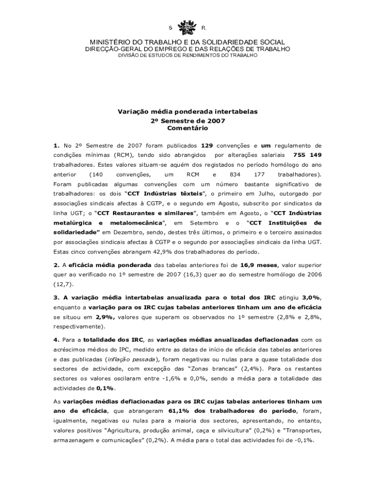 MINISTRIO DO TRABALHO E DA SOLIDARIEDADE SOCIAL DIRECOGERAL DO EMPREGO E DAS RELAES DE TRABALHO DIVISO DE ESTUDOS DE RENDIMENTOS DO TRABALHOVariao mdia ponderada intertabelas 2 Semestre de 2007 Comentrio
