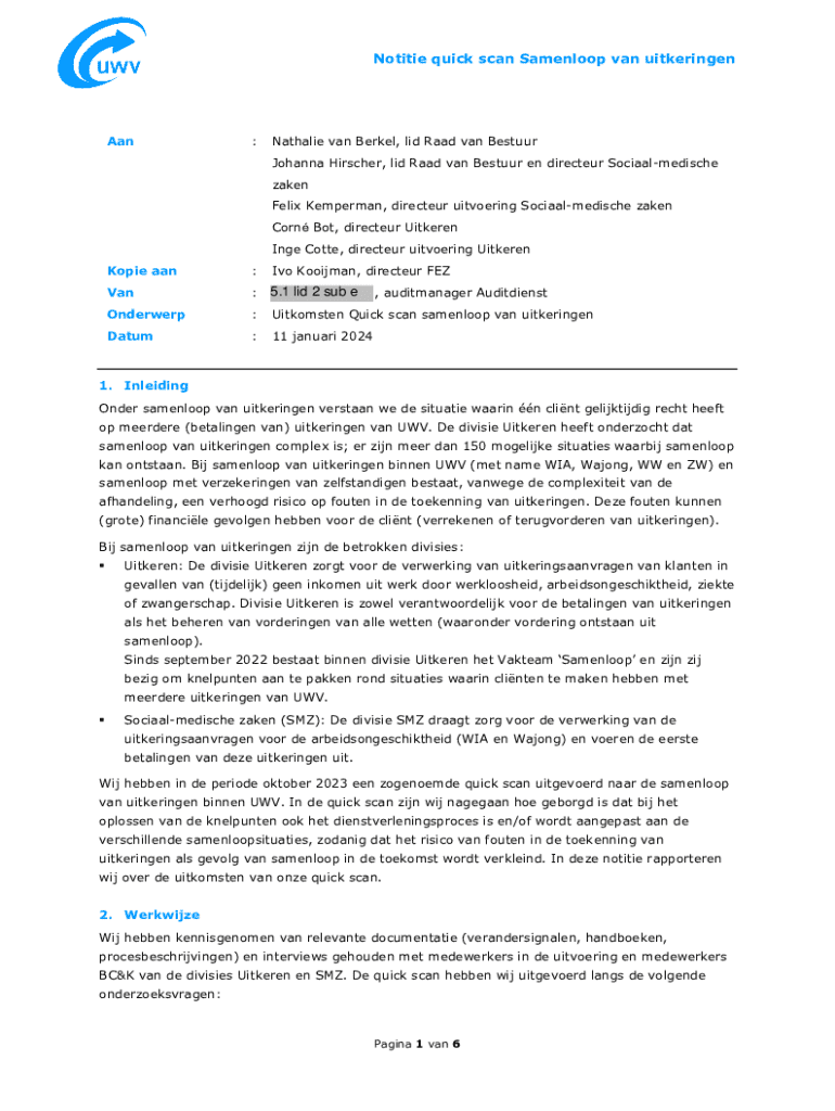 Deze notitie rapporteert over de uitkomsten van een quick scan naar de samenloop van uitkeringen binnen UWV. Hierin wordt ingegaan op de complexe situaties waarbij cliënten gelijktijdig recht hebben