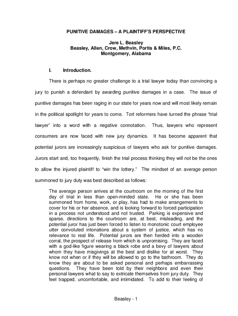 PUNITIVE DAMAGES A PLAINTIFFS PERSPECTIVE Jere L. Beasley Beasley, Allen, Crow, Methvin, Portis & Miles, P.C. Montgomery, Alabama I.Introduction.There is perhaps no greater challenge to a trial lawyer