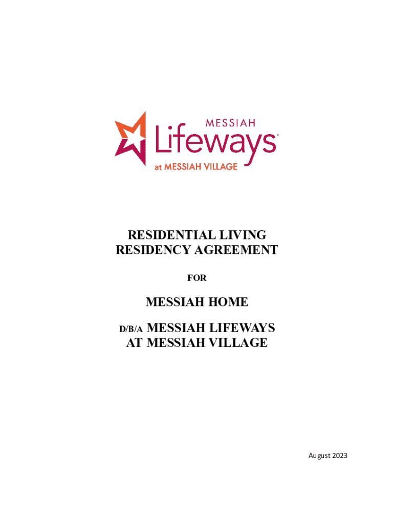 This document outlines the terms and conditions of residency at Messiah Village, including provisions for age, health, financial requirements, entrance fees, monthly service fees, refund options, and rights and responsibilities of residents.