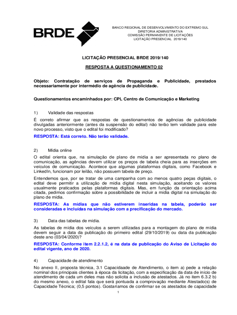 BANCO REGIONAL DE DESENVOLVIMENTO DO EXTREMO SUL DIRETORIA ADMINISTRATIVA COMISSO PERMANENTE DE LICITAES LICITAO PRESENCIAL 2019/140LICITAO PRESENCIAL BRDE 2019/140 RESPOSTA A QUESTIONAMENTO 02 Objeto: