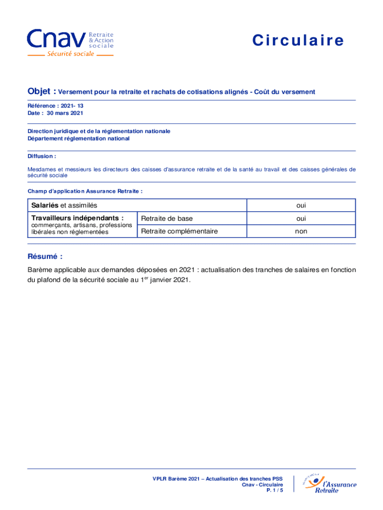 CirculaireObjet : Versement pour la retraite et rachats de cotisations aligns Cot du versement Rfrence : 2021 13 Date : 30 mars 2021 Direction juridique et de la rglementation nationale Dpartement
