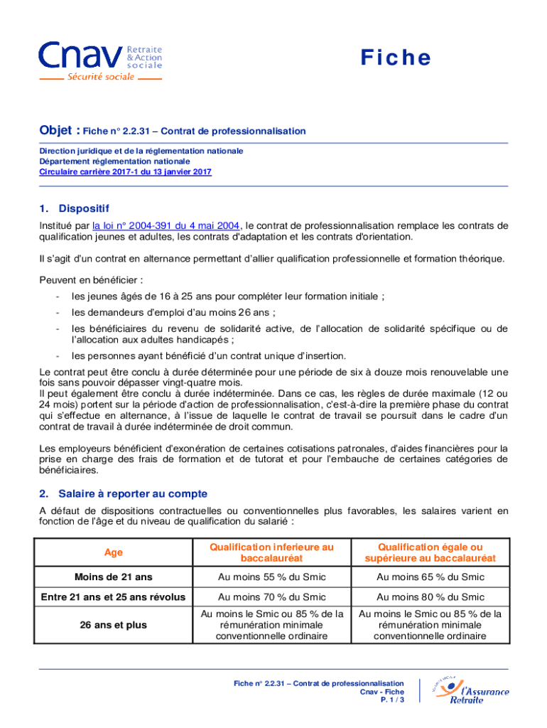 FicheObjet : Fiche n 2.2.31 Contrat de professionnalisation Direction juridique et de la rglementation nationale Dpartement rglementation nationale Circulaire carrire 20171 du 13 janvier 20171. Dispositif