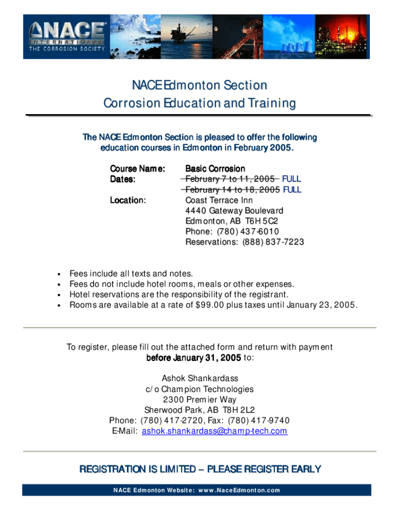 This document provides information regarding the upcoming corrosion education courses offered by the NACE Edmonton Section in February 2005. It includes details about the course names, dates, location, registration process, fees, and contact information for registration. Limited slots are available, and early registration is encouraged.