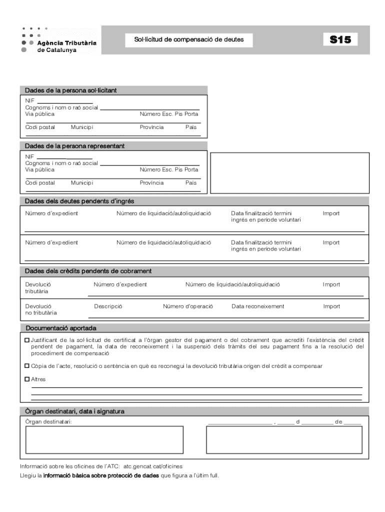 Aquest formulari és per a la sol·licitud de compensació de deutes pendents d’ingrés i crèdits pendents de cobrament davant l\'Agència Tributària de Catalunya. Inclou dades del sol·licitant