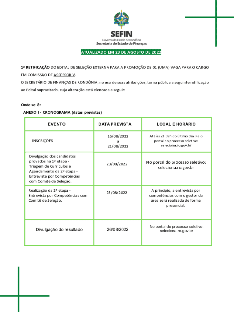 ATUALIZADO EM 23 DE AGOSTO DE 2022 1 RETIFICAO DO EDITAL DE SELEO EXTERNA PARA A PROMOO DE 01 (UMA) VAGA PARA O CARGO EM COMISSO DE ASSESSOR V. O SECRETRIO DE FINANAS DE RONDNIA, no uso de suas atribuies,