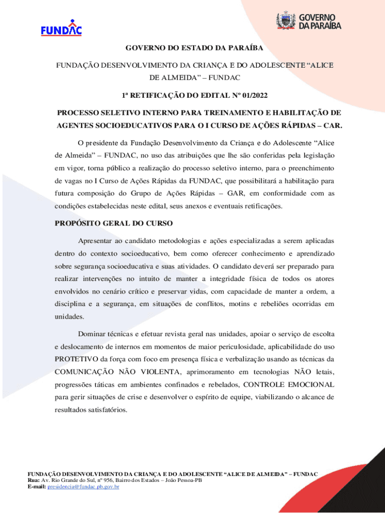 GOVERNO DO ESTADO DA PARABA FUNDAO DESENVOLVIMENTO DA CRIANA E DO ADOLESCENTE ALICE DE ALMEIDA FUNDAC 1 RETIFICAO DO EDITAL N 01/2022 PROCESSO SELETIVO INTERNO PARA TREINAMENTO E HABILITAO DE AGENTES