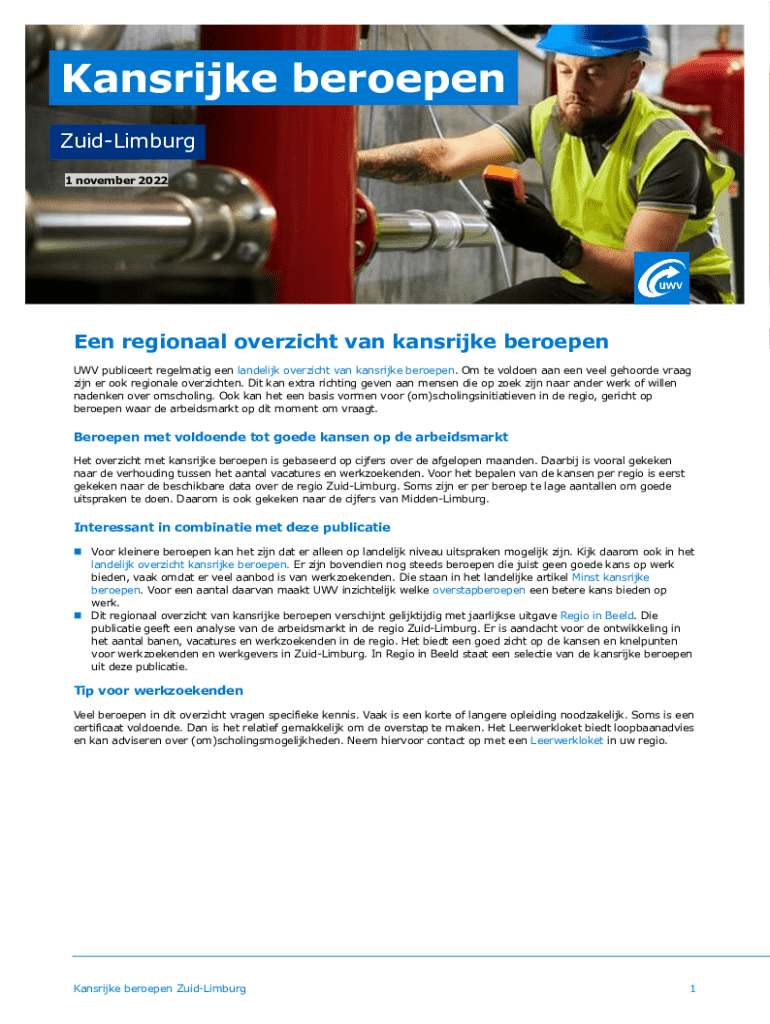 Kansrijke beroepen ZuidLimburg 1 november 2022Een regionaal overzicht van kansrijke beroepen UWV publiceert regelmatig een landelijk overzicht van kansrijke beroepen. Om te voldoen aan een veel gehoorde
