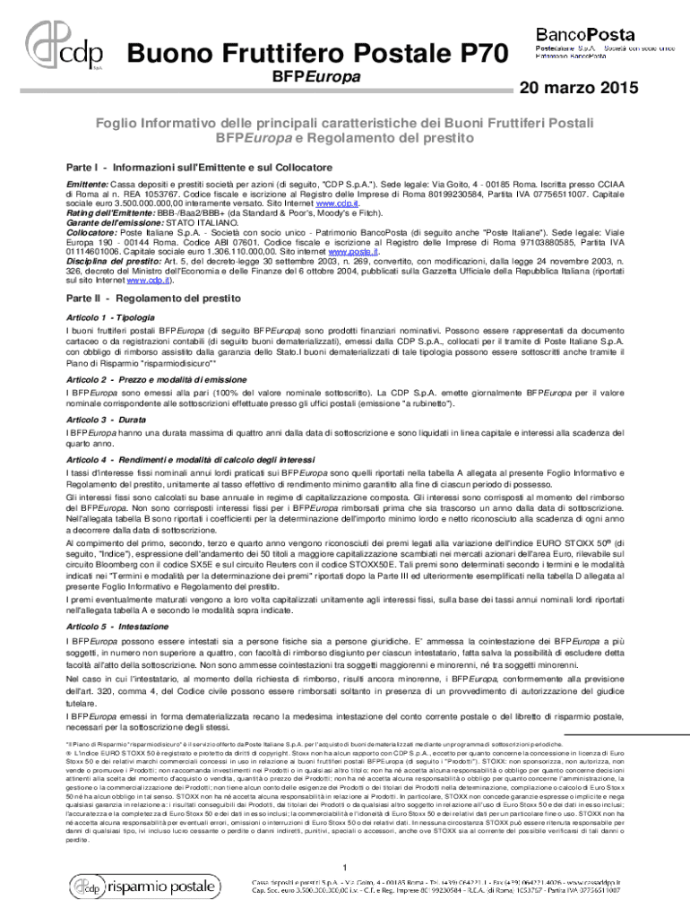Foglio Informativo delle principali caratteristiche dei Buoni Fruttiferi Postali BFPEuropa e Regolamento del prestito.