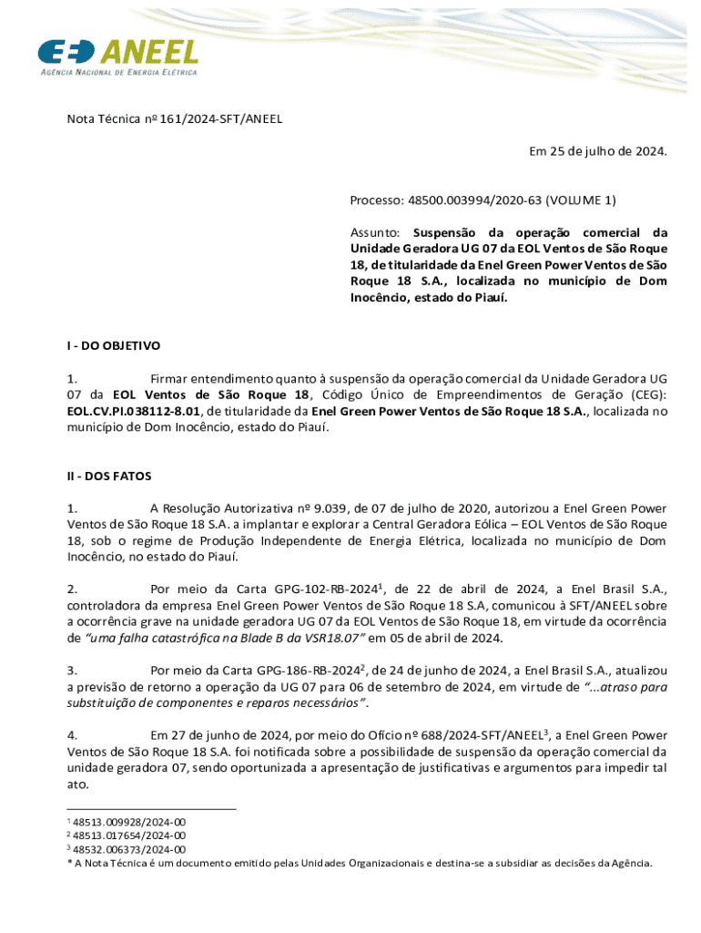 Documento emitido pela ANEEL com objetivo de formalizar a suspensão da operação comercial da Unidade Geradora UG 07 da EOL Ventos de São Roque 18 devido a uma falha catastrófica. A análise inclui