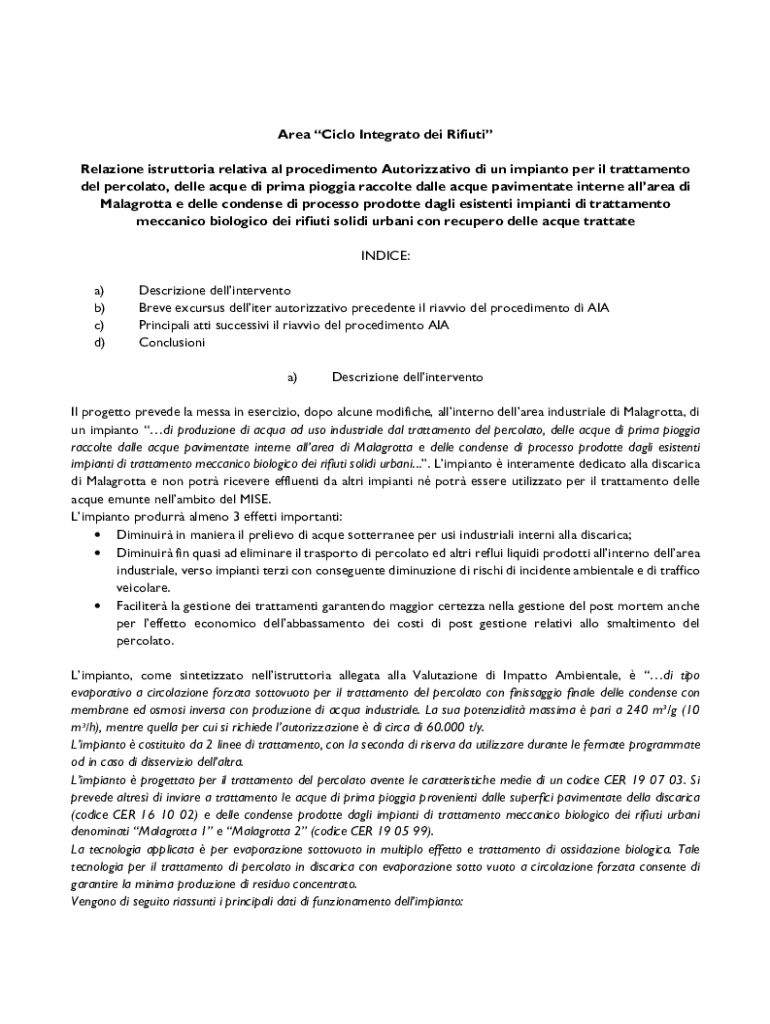 Area Ciclo Integrato dei Rifiuti Relazione istruttoria relativa al procedimento Autorizzativo di un impianto per il trattamento del percolato, delle acque di prima pioggia raccolte dalle acque pavimentate