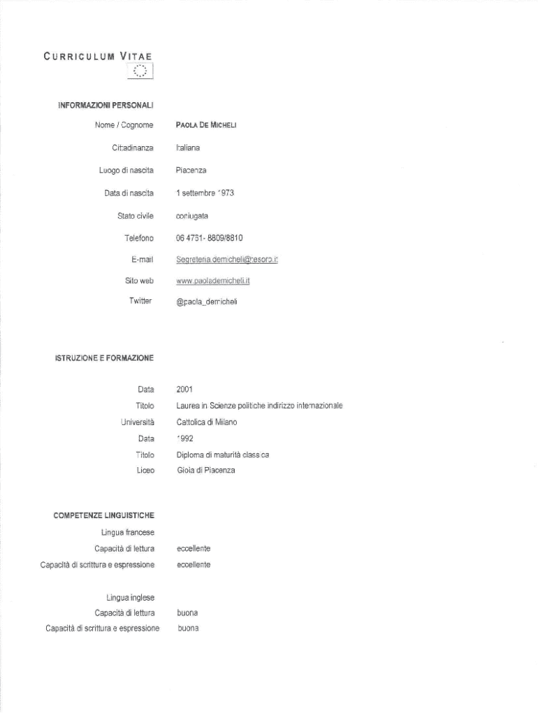 CURRICULUM VITAE INFORMAZIONI PERSONALINome I Cognome Cittadinanza Luogo di nascita Data di nascita Stato civile Telefono Email Sito web TwitterPAOLA DE MICHELIItaliana Piacenza 1 settembre 1973 coniugata