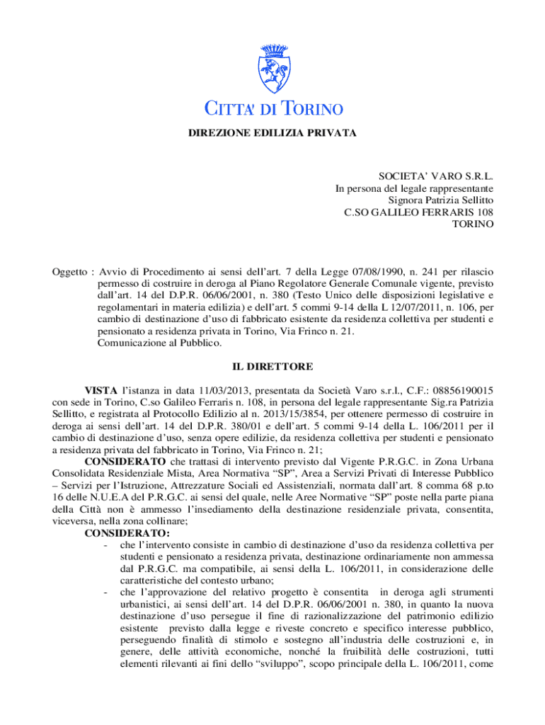 DIREZIONE EDILIZIA PRIVATASOCIETA VARO S.R.L. In persona del legale rappresentante Signora Patrizia Sellitto C.SO GALILEO FERRARIS 108 TORINOOggetto : Avvio di Procedimento ai sensi dellart. 7 della