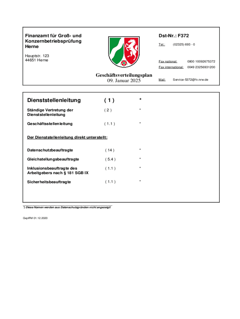 Finanzamt fr Gro und Konzernbetriebsprfung HerneDstNr.: F372 Tel.:Hauptstr. 123 44651 HerneGeschftsverteilungsplan 09. Januar 2025Dienststellenleitung(1)*Stndige Vertretung der Dienststellenleitung(2)*Geschftsstellenleitung(