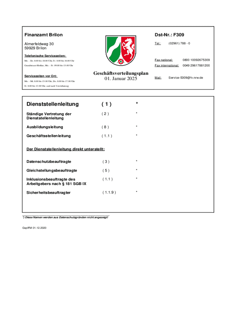 Finanzamt BrilonDstNr.: F309Almerfeldweg 30 59929 BrilonTel.:(02961) 788 0Telefonische Servicezeiten: Mo. Do. 8:00 bis 18:00 Uhr, Fr. 8:00 bis 16:00 UhrFax national:0800 10092675309GrundsteuerHotline,