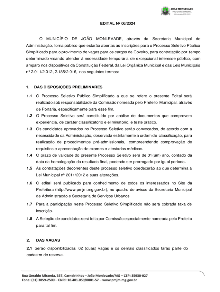 Este edital torna público a abertura das inscrições para o processo seletivo simplificado visando à contratação de Coveiro para o Município de João Monlevade, com vagas limitadas e prazos
