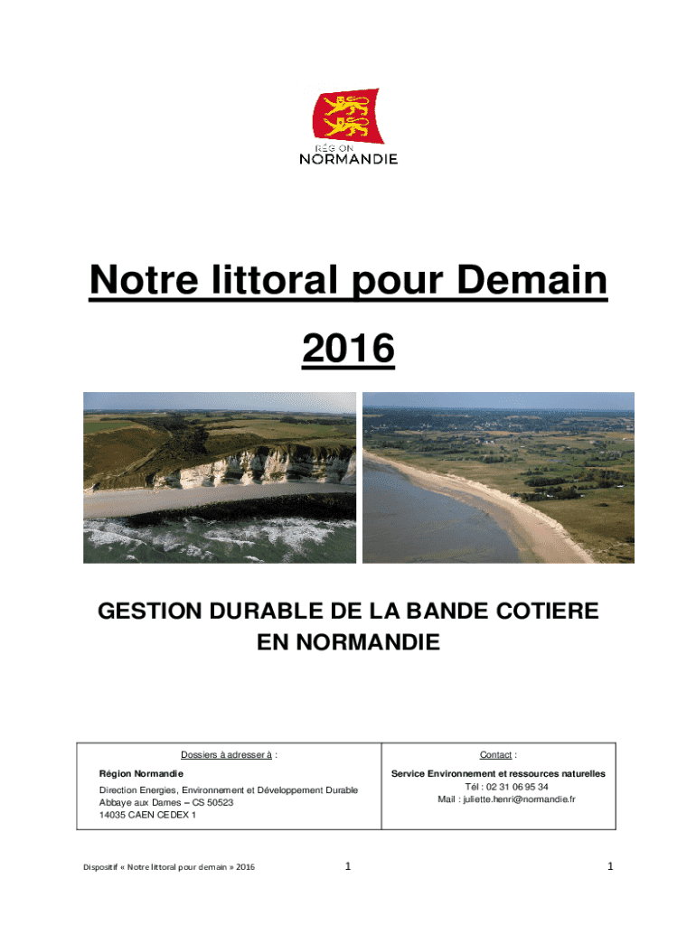 Notre littoral pour Demain 2016GESTION DURABLE DE LA BANDE COTIERE EN NORMANDIEDossiers adresser :Contact :Rgion Normandie Direction Energies, Environnement et Dveloppement Durable Abbaye aux Dames