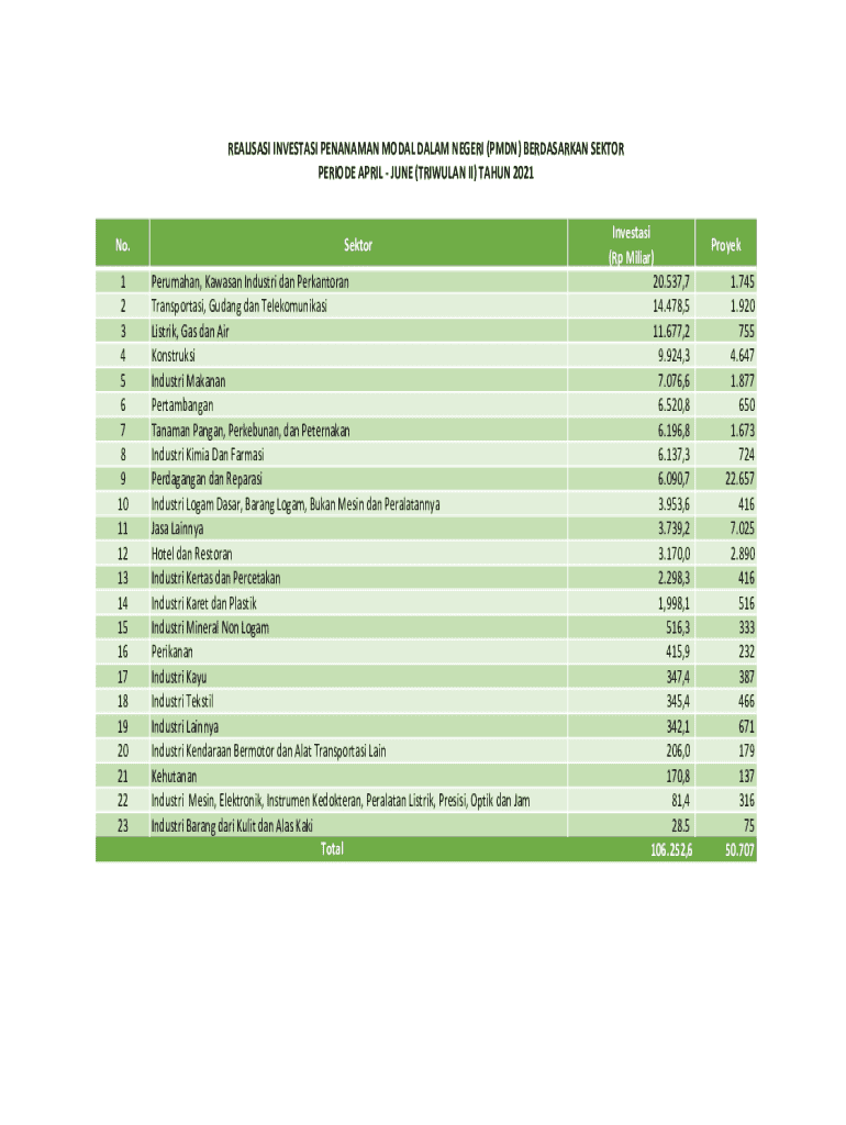 REALISASI INVESTASI PENANAMAN MODAL DALAM NEGERI (PMDN) BERDASARKAN SEKTOR PERIODE APRIL JUNE (TRIWULAN II) TAHUN 2021No. 1 2 3 4 5 6 7 8 9 10 11 12 13 14 15 16 17 18 19 20 21 22 23Sektor Perumahan,