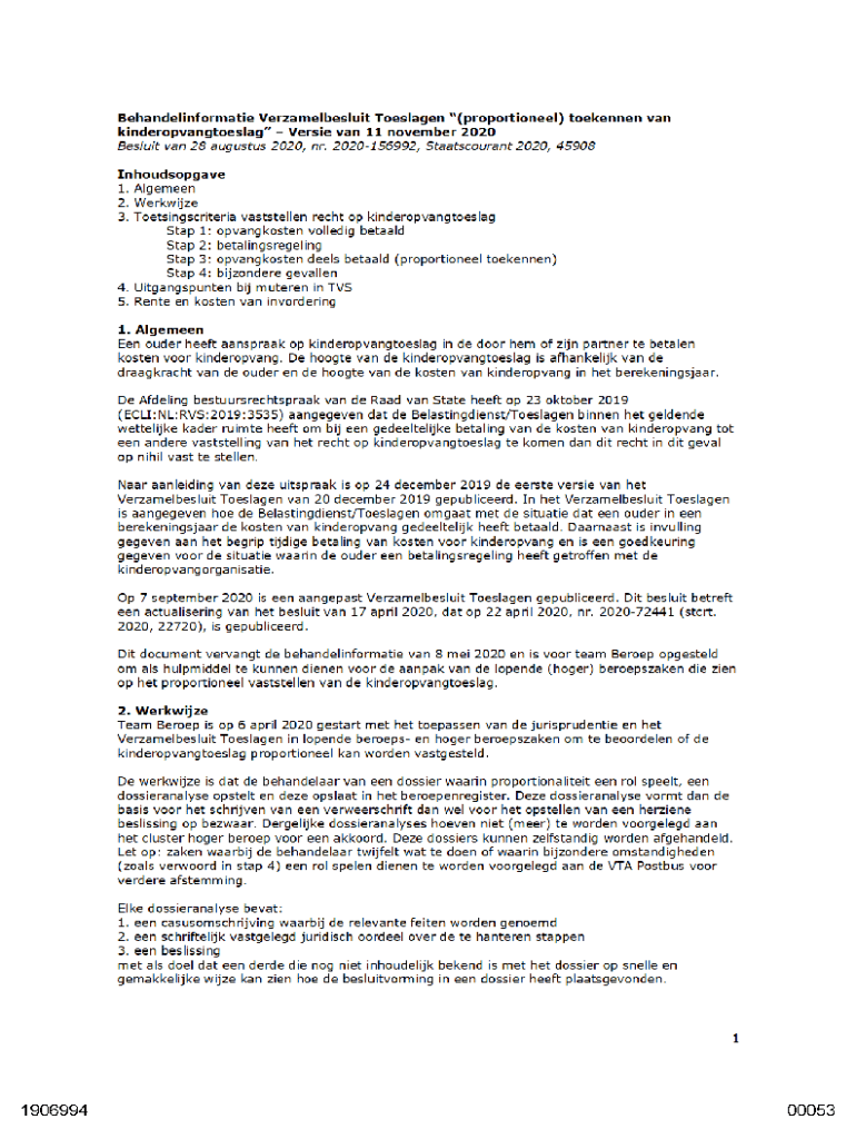 Behandelinformatie Verzamelbesluit Versiekinderopvangtoeslag Besluitvan28 augustus 2020nrvanToeslagenproportioneel toekennenvan11 november 20202020 156992Staatscourant 2020 45908Inhoudsopgave 1 Algemeen