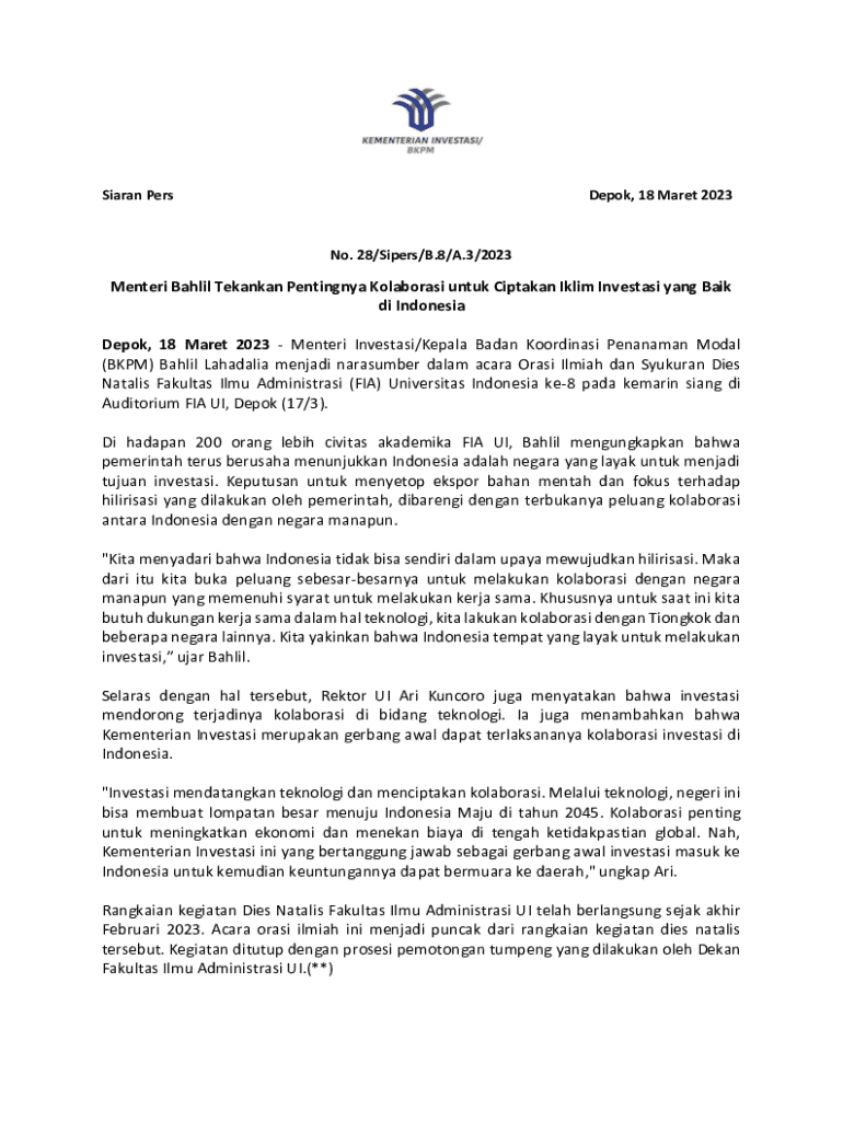 Siaran PersDepok, 18 Maret 2023No. 28/Sipers/B.8/A.3/2023Menteri Bahlil Tekankan Pentingnya Kolaborasi untuk Ciptakan Iklim Investasi yang Baik di Indonesia Depok, 18 Maret 2023 Menteri Investasi/Kepala