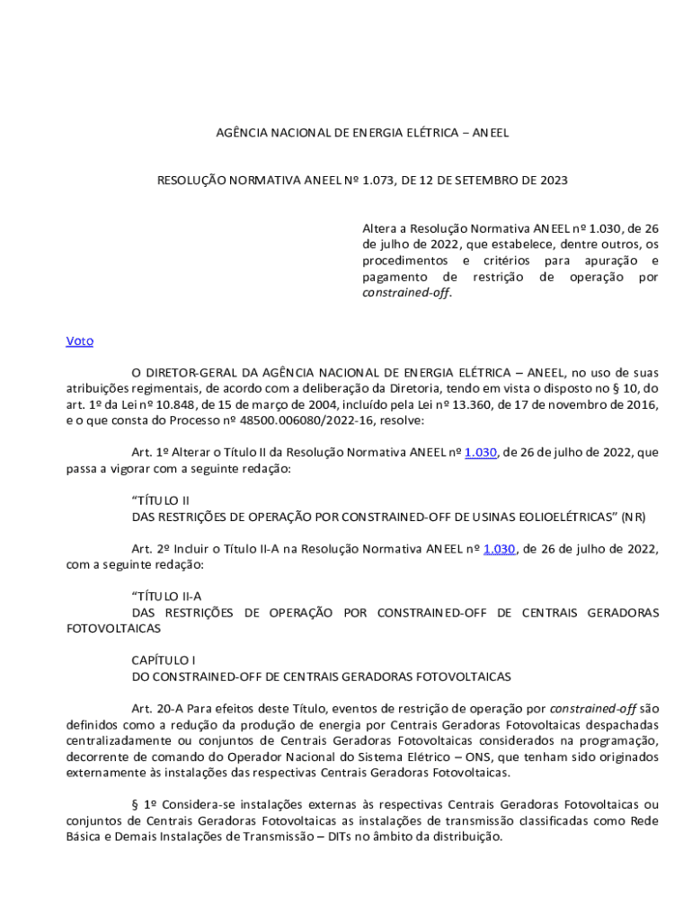 AGNCIA NACIONAL DE ENERGIA ELTRICA ANEELRESOLUO NORMATIVA ANEEL N 1.073, DE 12 DE SETEMBRO DE 2023Altera a Resoluo Normativa ANEEL n 1.030, de 26 de julho de 2022, que estabelece, dentre outros, os