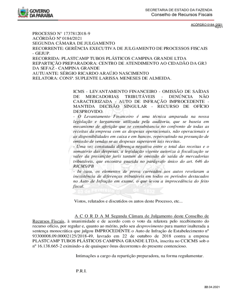 ACRDO 0184 /2021 Pgina 1PROCESSO N 17378120189 ACRDO N 0184/2021 SEGUNDA CMARA DE JULGAMENTO RECORRENTE: GERNCIA EXECUTIVA DE JULGAMENTO DE PROCESSOS FISCAIS GEJUP. RECORRIDA: PLASTCAMP TUBOS PLSTICOS