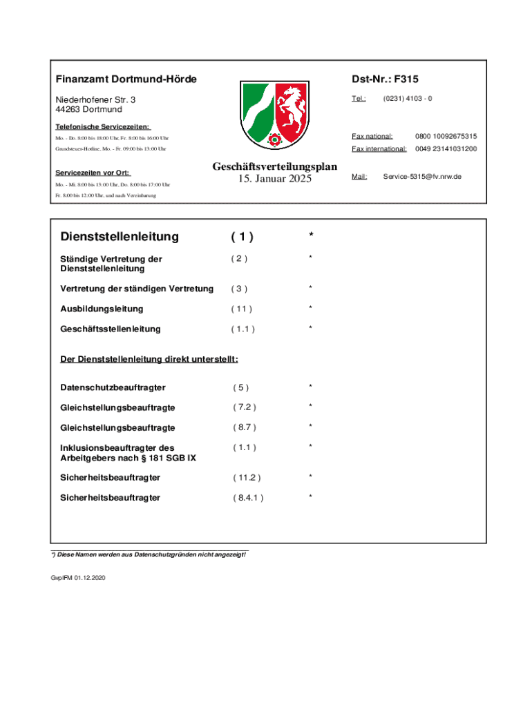 Finanzamt DortmundHrdeDstNr.: F315Niederhofener Str. 3 44263 DortmundTel.:(0231) 4103 0Telefonische Servicezeiten: Mo. Do. 8:00 bis 18:00 Uhr, Fr. 8:00 bis 16:00 UhrFax national:0800 10092675315GrundsteuerHotline,