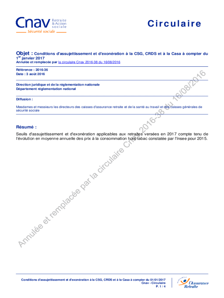 CirculaireObjet : Conditions d\'assujettissement et d\'exonration la CSG, CRDS et la Casa compter du 1er janvier 2017Annule et remplace par la circulaire Cnav 201638 du 16/08/2016 Rfrence : 201636