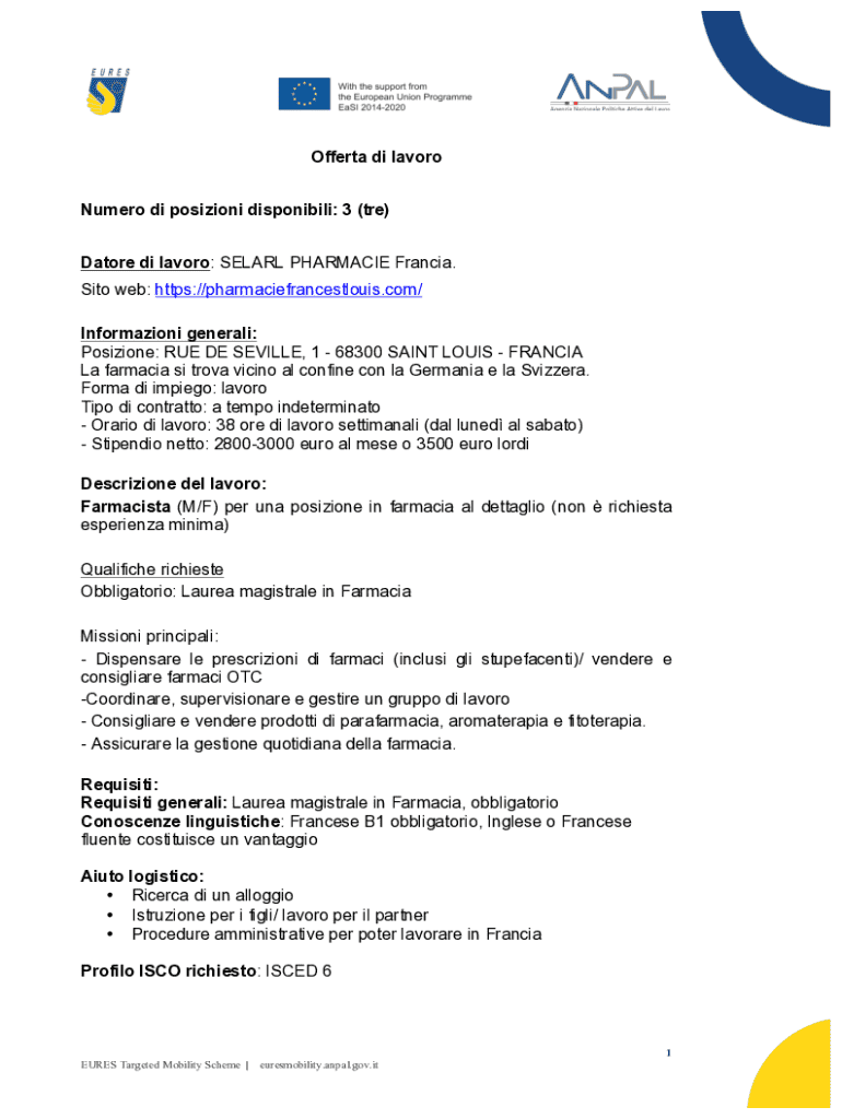 Offerta di lavoro Numero di posizioni disponibili: 3 (tre) Datore di lavoro: SELARL PHARMACIE Francia. Sito web: https://pharmaciefrancestlouis.com/ Informazioni generali: Posizione: RUE DE SEVILLE,