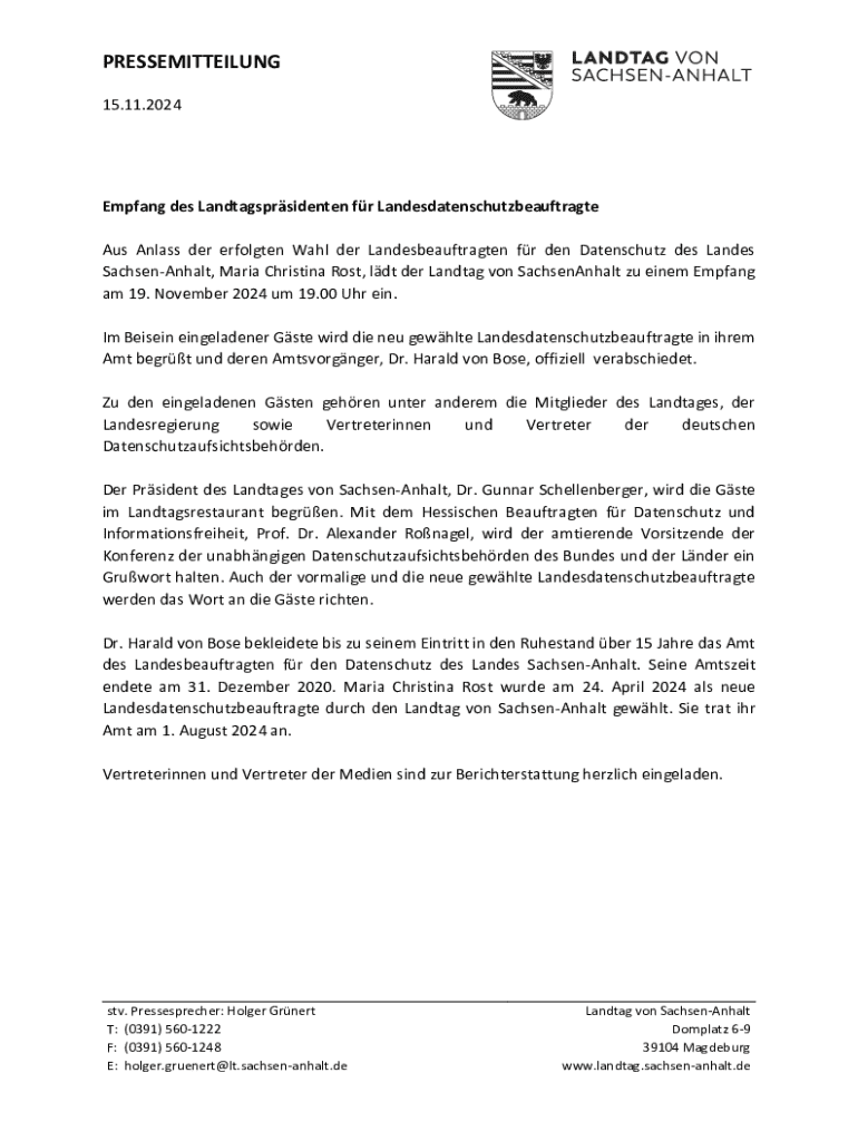 PRESSEMITTEILUNG 15.11.2024Empfang des Landtagsprsidenten fr Landesdatenschutzbeauftragte Aus Anlass der erfolgten Wahl der Landesbeauftragten fr den Datenschutz des Landes SachsenAnhalt, Maria Christina