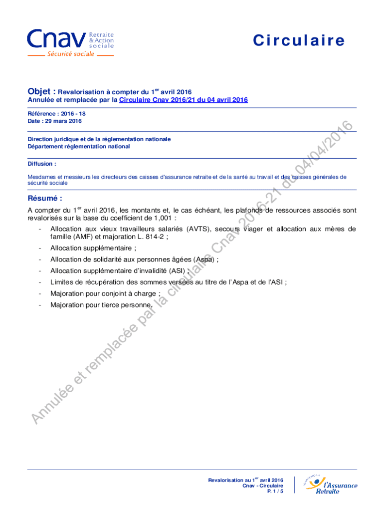 Cette circulaire traite de la revalorisation des allocations et des plafonds de ressources à compter du 1er avril 2016, y compris les allocations aux vieux travailleurs, l\'allocation supplémentaire,