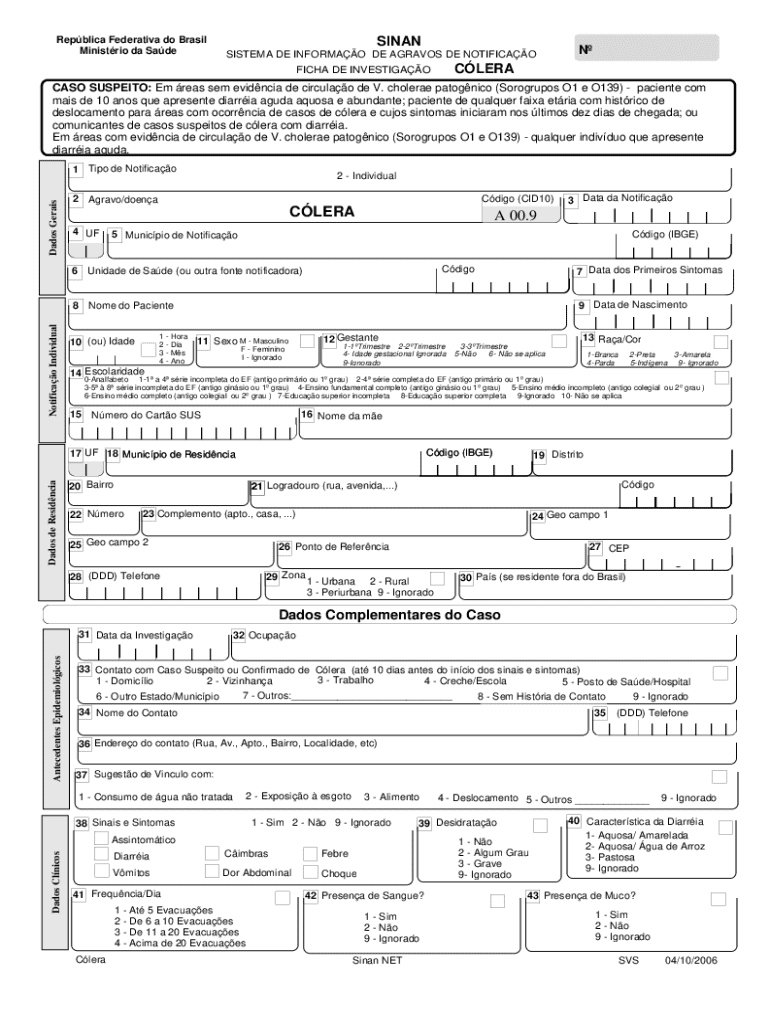 Documento utilizado para notificação e investigação de casos suspeitos de cólera no Brasil, detalhando informações sobre o paciente, sintomas, histórico epidemiológico e dados de contato.