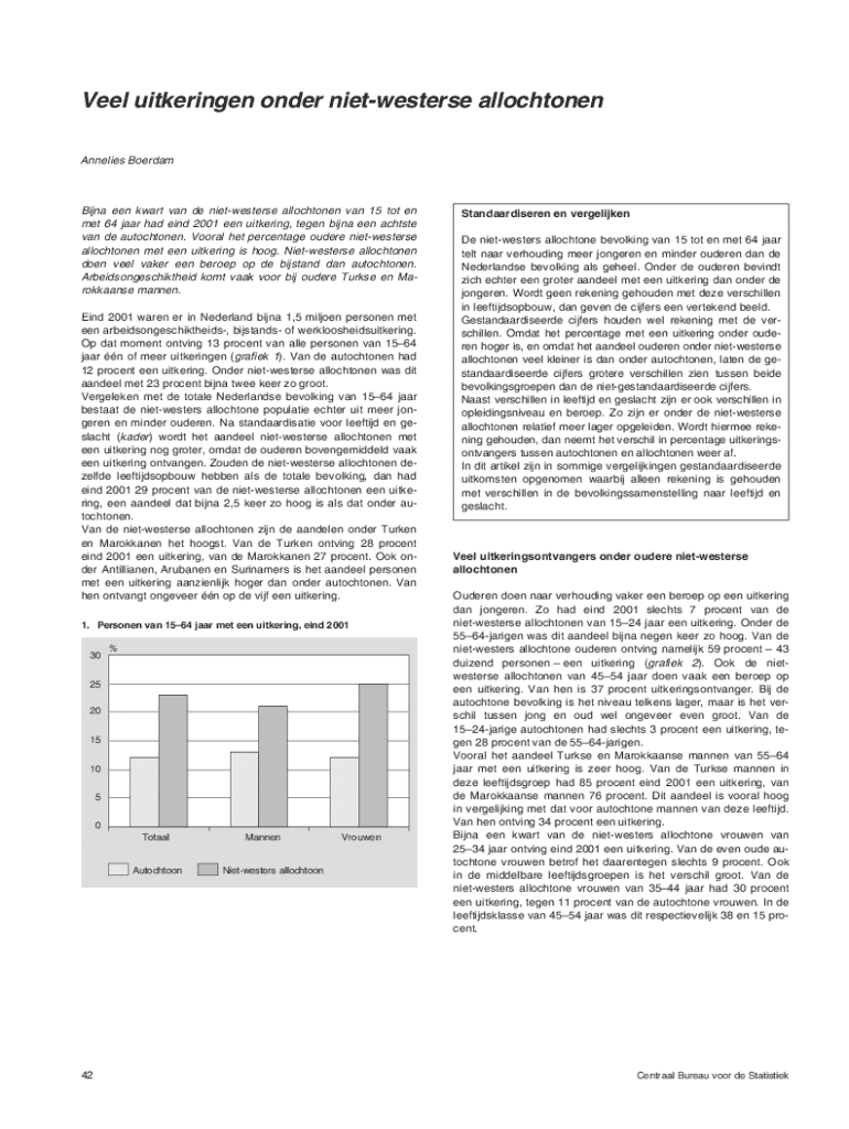Veel uitkeringen onder nietwesterse allochtonen Annelies BoerdamBijna een kwart van de nietwesterse allochtonen van 15 tot en met 64 jaar had eind 2001 een uitkering, tegen bijna een achtste van de