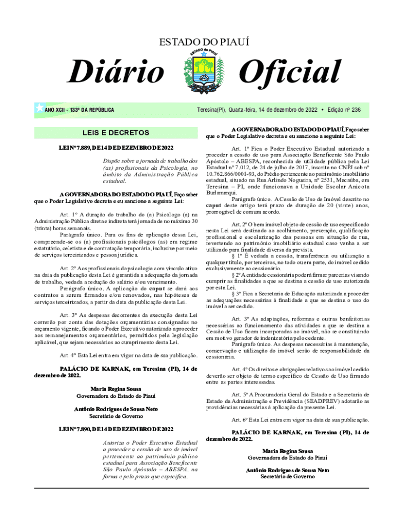 ESTADO DO PIAUDirio ANO XCII 133 DA REPBLICAOficial Teresina(PI), Quartafeira, 14 de dezembro de 2022 Edio n 236LEIS E DECRETOS LEI N 7.889, DE 14 DE DEZEMBRO DE 2022 Dispe sobre a jornada de trabalho
