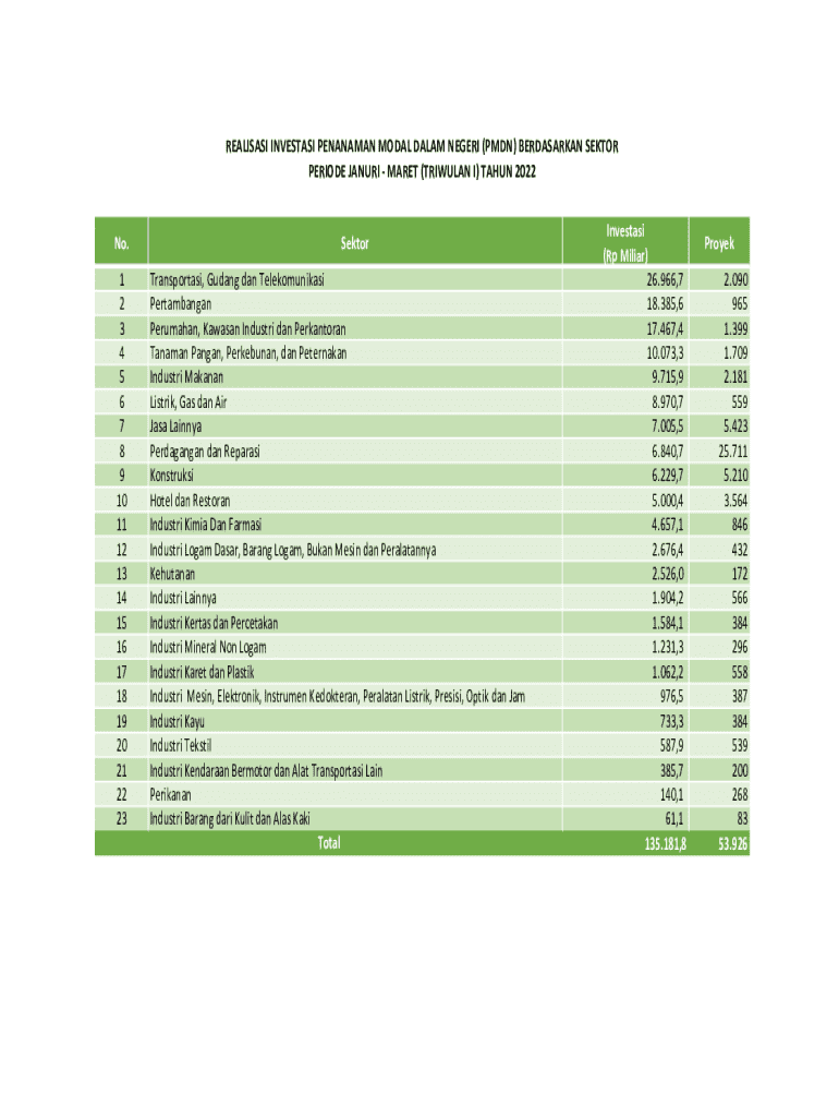 REALISASI INVESTASI PENANAMAN MODAL DALAM NEGERI (PMDN) BERDASARKAN SEKTOR PERIODE JANURI MARET (TRIWULAN I) TAHUN 2022No. 1 2 3 4 5 6 7 8 9 10 11 12 13 14 15 16 17 18 19 20 21 22 23Sektor Transportasi,