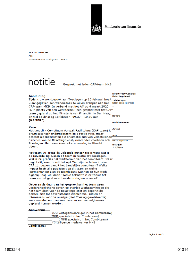 Ministerie van FinancienTER INFORMATIE Aan StaatssecretarisToeslagenen DouanenotitieGesprekmet leden CAF team MKBDirectoraat GeneraalAanleiding Tijdens uw werkbezoek uaangegeveneenToeslagenop 10 februari