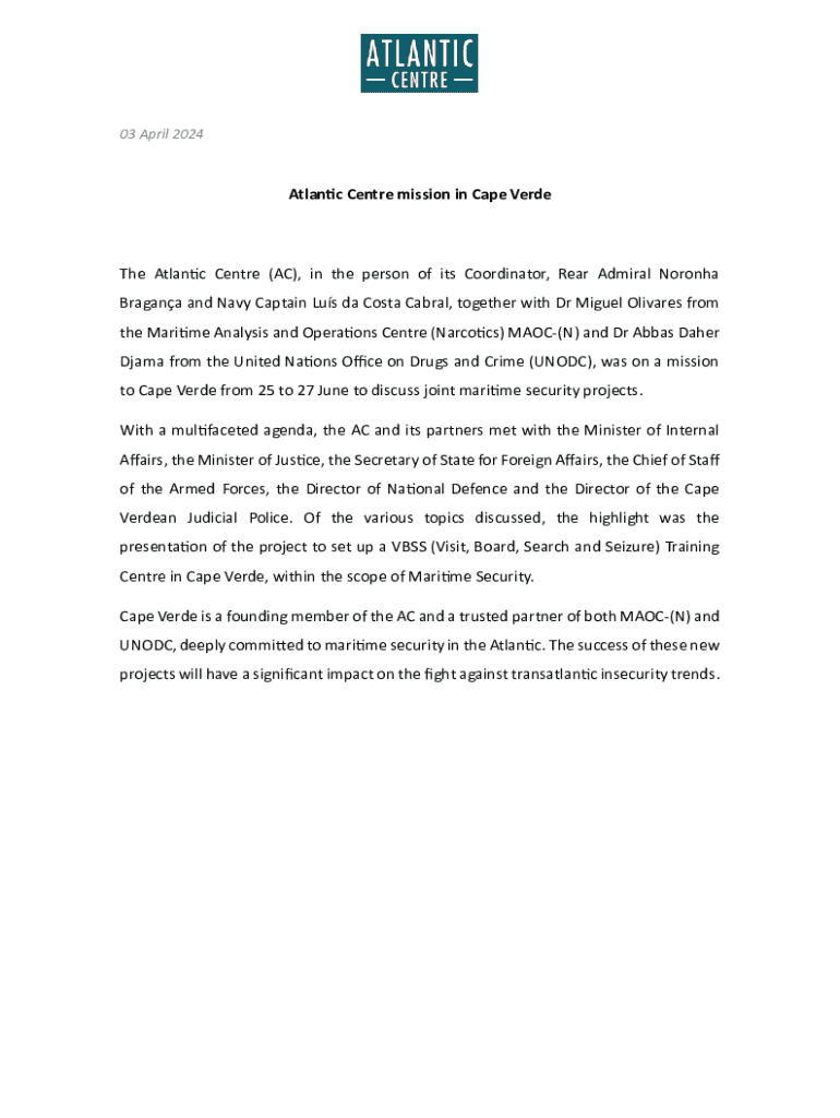 03 April 2024Atlantic Centre mission in Cape VerdeThe Atlantic Centre (AC), in the person of its Coordinator, Rear Admiral Noronha Bragana and Navy Captain Lus da Costa Cabral, together with Dr Miguel