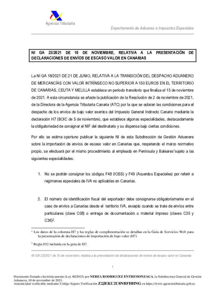 Este documento establece las directrices para la presentación de declaraciones de envíos de escaso valor en Canarias, definiendo requisitos específicos como la obligatoriedad de consignar el NIF