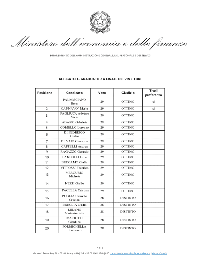 Ministero delleconomia e delle finanze DIPARTIMENTO DELLAMMINISTRAZIONE GENERALE, DEL PERSONALE E DEI SERVIZIALLEGATO 1 GRADUATORIA FINALE DEI VINCITORICandidatoVotoGiudizioTitoli preferenza1PALMISCIANO