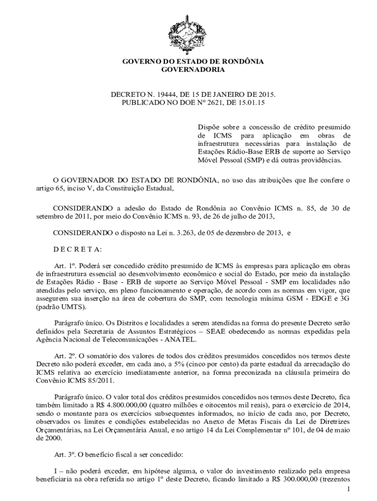 GOVERNO DO ESTADO DE RONDNIA GOVERNADORIA DECRETO N. 19444, DE 15 DE JANEIRO DE 2015. PUBLICADO NO DOE N 2621, DE 15.01.15 Dispe sobre a concesso de crdito presumido de ICMS para aplicao em obras