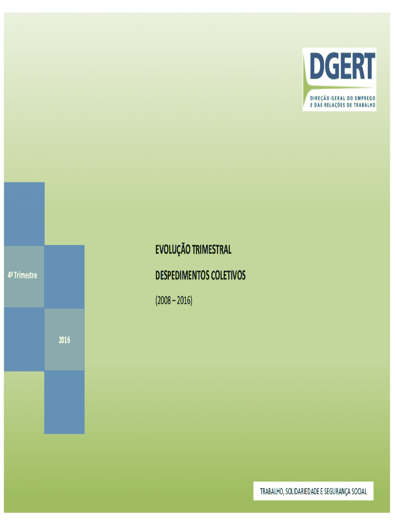 EVOLUO TRIMESTRAL DESPEDIMENTOS COLETIVOS4 Trimestre(2008 2016) 2016TRABALHO, SOLIDARIEDADE E SEGURANA SOCIALTtulo: Evoluo trimestral despedimentos coletivos. Data: Janeiro de 2017. Elaborado com