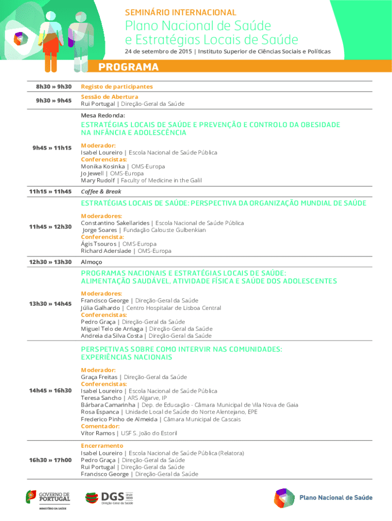 SEMINRIO INTERNACIONALPlano Nacional de Sade e Estratgias Locais de Sade 24 de setembro de 2015 | Instituto Superior de Cincias Sociais e PolticasPROGRAMA 8h30 9h30Registo de participantes9h30 9h45Sesso