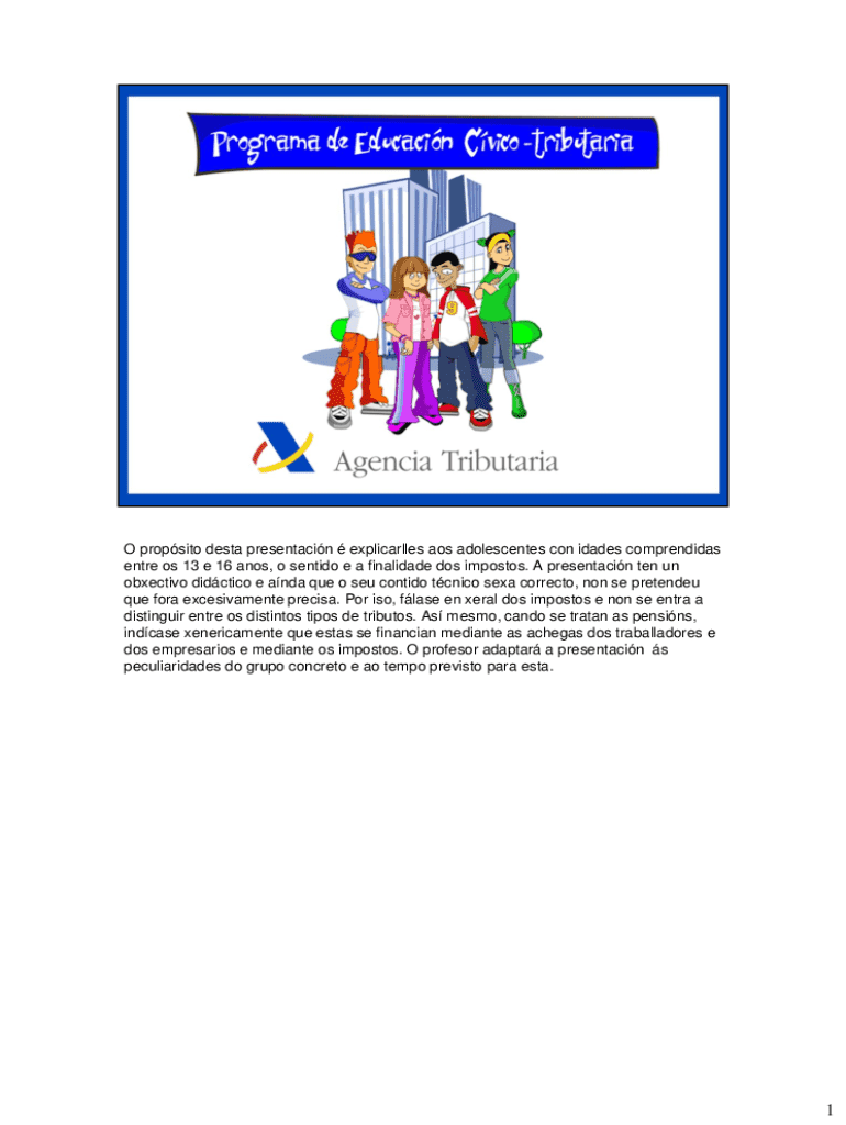 O propsito desta presentacin explicarlles aos adolescentes con idades comprendidas entre os 13 e 16 anos, o sentido e a finalidade dos impostos. A presentacin ten un obxectivo didctico e anda que