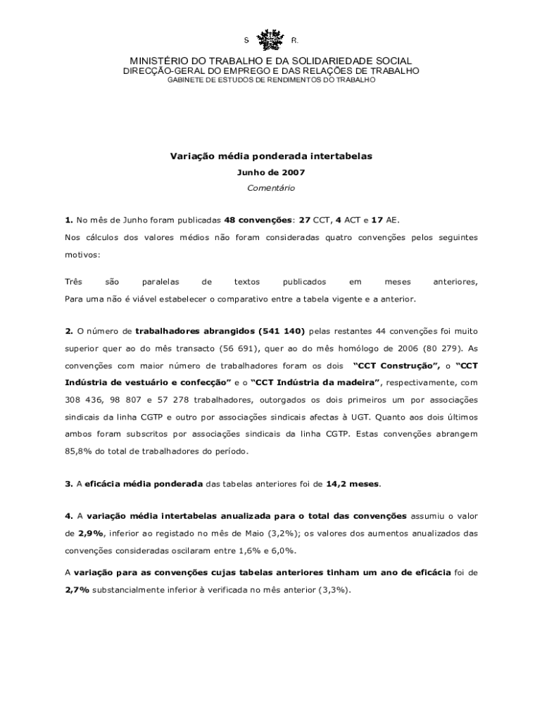 MINISTRIO DO TRABALHO E DA SOLIDARIEDADE SOCIAL DIRECOGERAL DO EMPREGO E DAS RELAES DE TRABALHO GABINETE DE ESTUDOS DE RENDIMENTOS DO TRABALHOVariao mdia ponderada intertabelas Junho de 2007 Comentrio1.