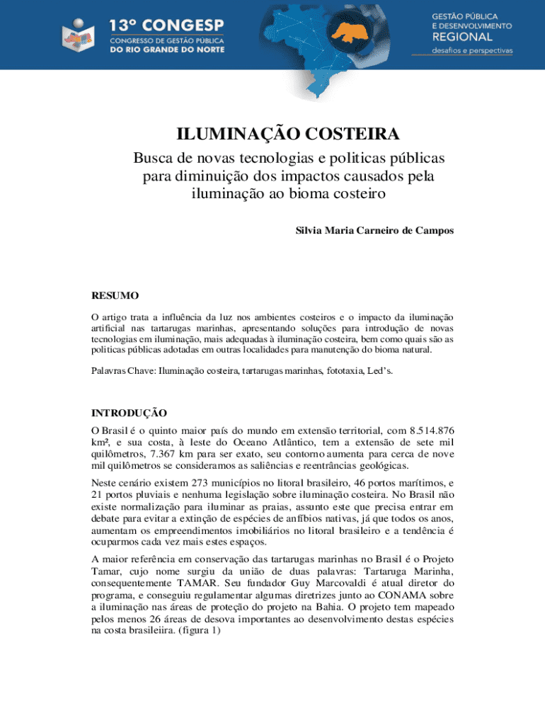 ILUMINAO COSTEIRA Busca de novas tecnologias e politicas pblicas para diminuio dos impactos causados pela iluminao ao bioma costeiro Silvia Maria Carneiro de CamposRESUMO O artigo trata a influncia
