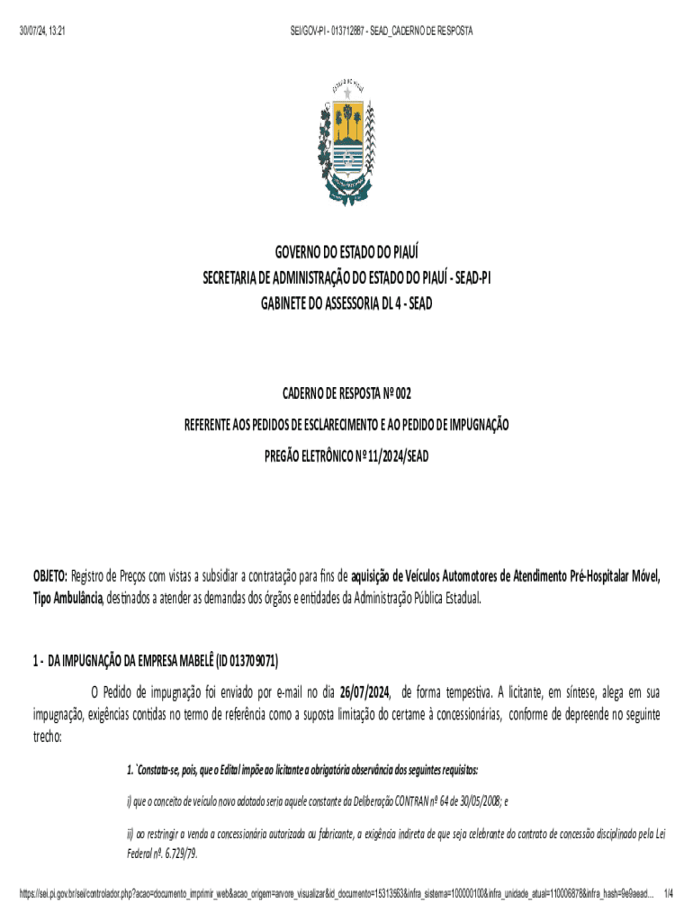 Documento referente aos pedidos de esclarecimento e impugnação no Pregão Eletrônico nº 11/2024 da Secretaria de Administração do Estado do Piauí, abordando a aquisição de veículos automotores
