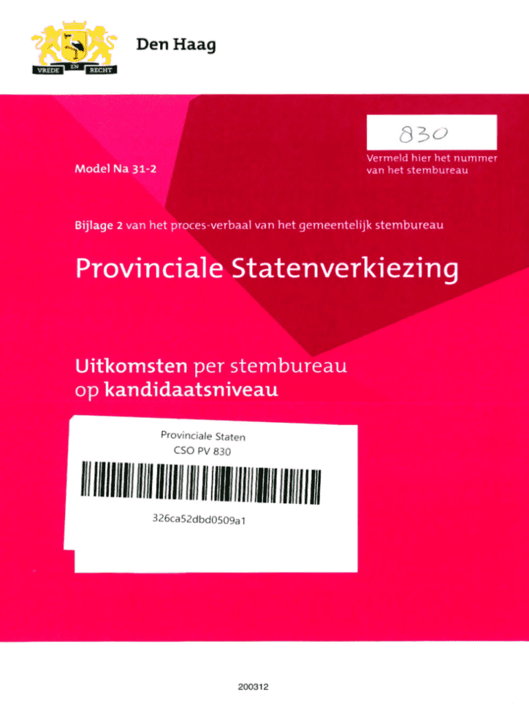 ) A VREDEDen HaagRECHTVermeld bier bet nummer van bet stembureauModel Na 312Bijlage 2 van bet procesverbaal van bet gemeentelijk stembureauProvinciale Statenverkiezing Uitkomsten per stembureau op